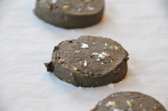 As for ingredients, I used Ghirardelli cocoa and bittersweet baking chocolate. I had to make a few substitutions because my grocery store didn’t have raw pistachios or maldon salt and the clock was ticking. I had to make do with roasted, salted pistachios in the shell and a sea-salt grinder. I was concerned that this combination would ruin the delicate interplay of salty and sweet flavors in the sables, so I compensated by sprinking on some coarse sanding sugar along with the salt.