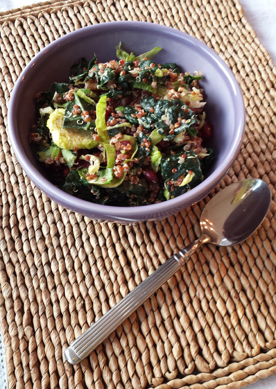 Now add the kale, Brussels sprouts, cranberries, pecans, and pomegranate seeds and toss to coat completely. Allow this mixture to sit for several hours (in the fridge would be ideal) to soften the kale leaves and Brussels sprouts.