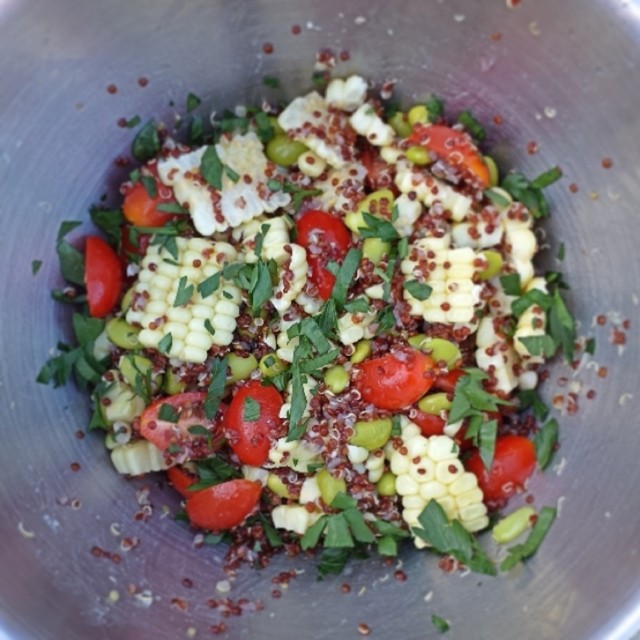 A riff on succotash, this summer salad adds a protein punch with the inclusion of both quinoa and edamame. In other words, this is not your mother’s corn salad. But the fresh summer farm stand flavors are reminiscent of your mother’s corn salad.