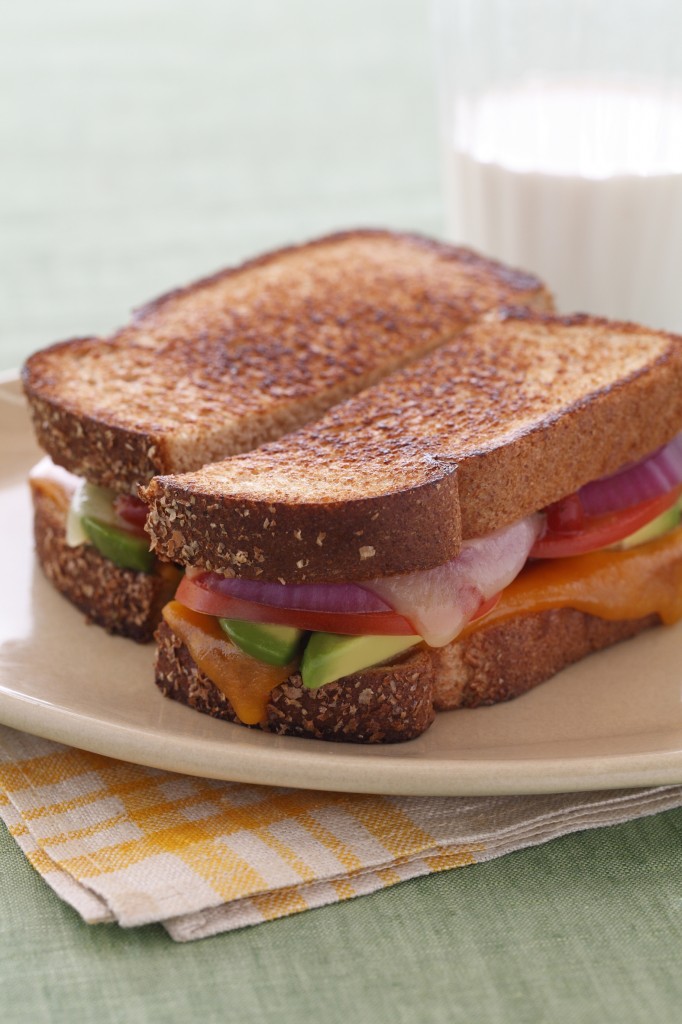 On each sandwich, place a slice of cheddar cheese, a layer of avocado, tomato, and onion slices. Add chili sauce to taste. Top with pepper jack cheese, and finish with remaining bread slices.