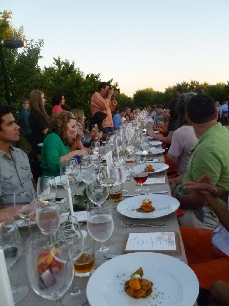 I sit down in between two groups of strangers. The faces in both groups are familiar because we were all on the tour together. The group to my right are parents and their grown children, spouses and partners, celebrating the Mom’s birthday. The people on my left comprise a team from Chez Panisse and the Edible Schoolyard Foundation. Also nearby is tonight’s MC for the event, food writer and blogger Carolyn Jung. Introductions ensue as we all settle in for tonight’s main event: the meal.