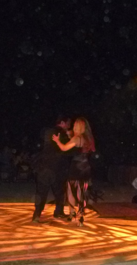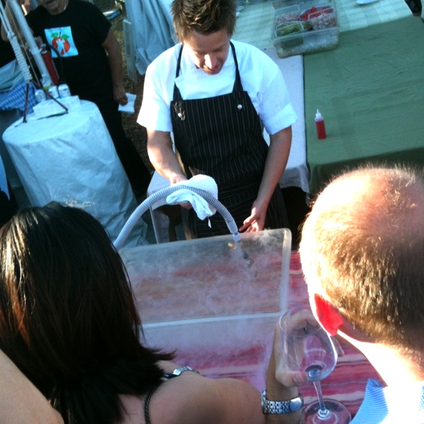 Winners, one and all, it’s time for dancing and dessert. Professional tango dancers take to the stage and Georgia and I wander over to get our ice cream cones. The ice cream is Santa Rosa Plum ice cream and somehow there is liquid nitrogen involved. This is chef Blais after all. The nice little surprise at the bottom of the cone? Dark chocolate. The cones were provided by Berkeley’s Ici Ice Cream.