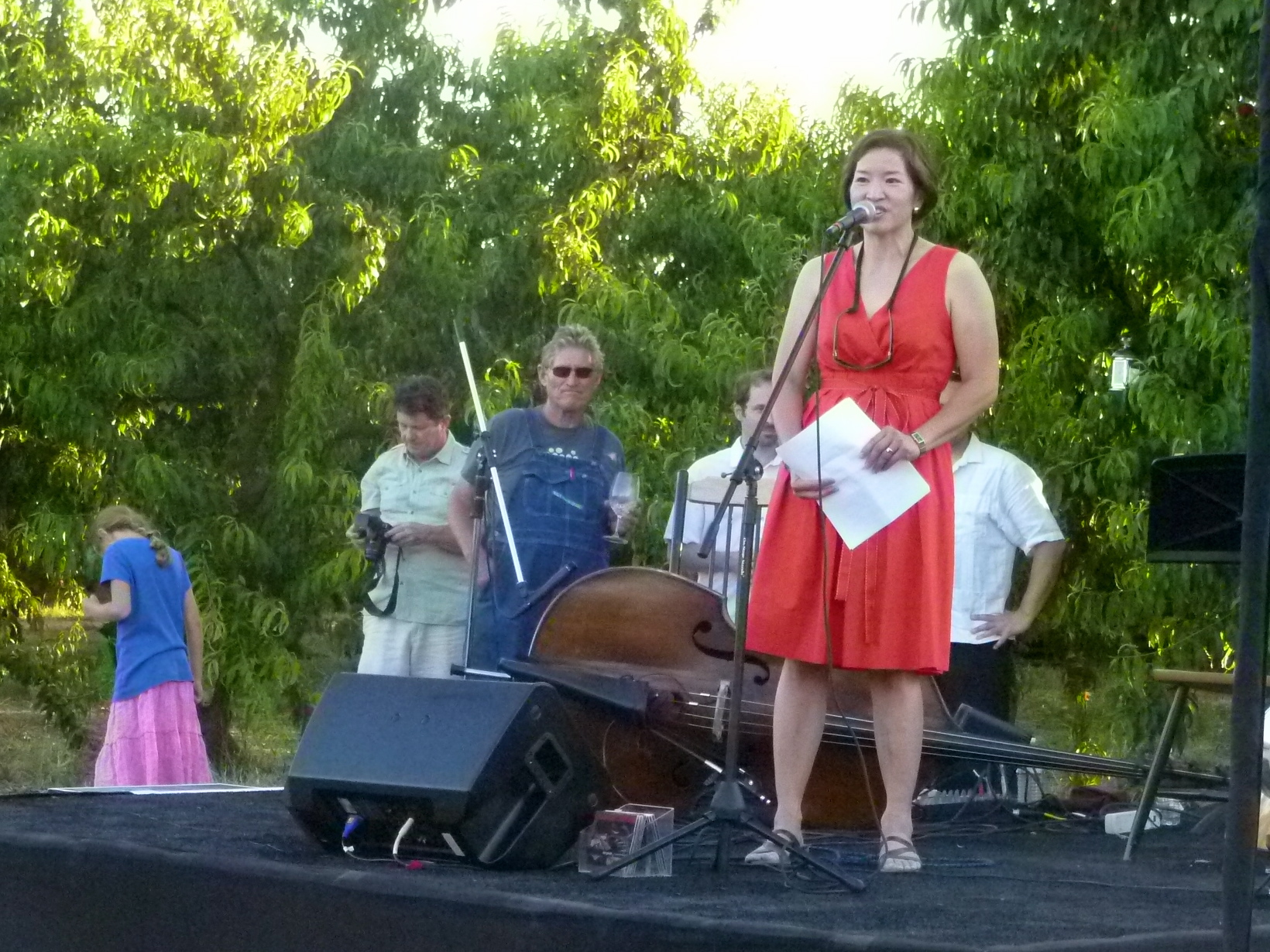 Carolyn Jung stands to announce the winners of the silent auction. Marguerite, the Mom of the family next to me, has placed a bid on having Farmer Al come to your home to do a tree pruning consultation. Her daughter, Georgia has recently planted several fruit-bearing trees, and her mother hopes to win this prize for her. Greg has bid on a private dinner for 6 with Chef Andrea.