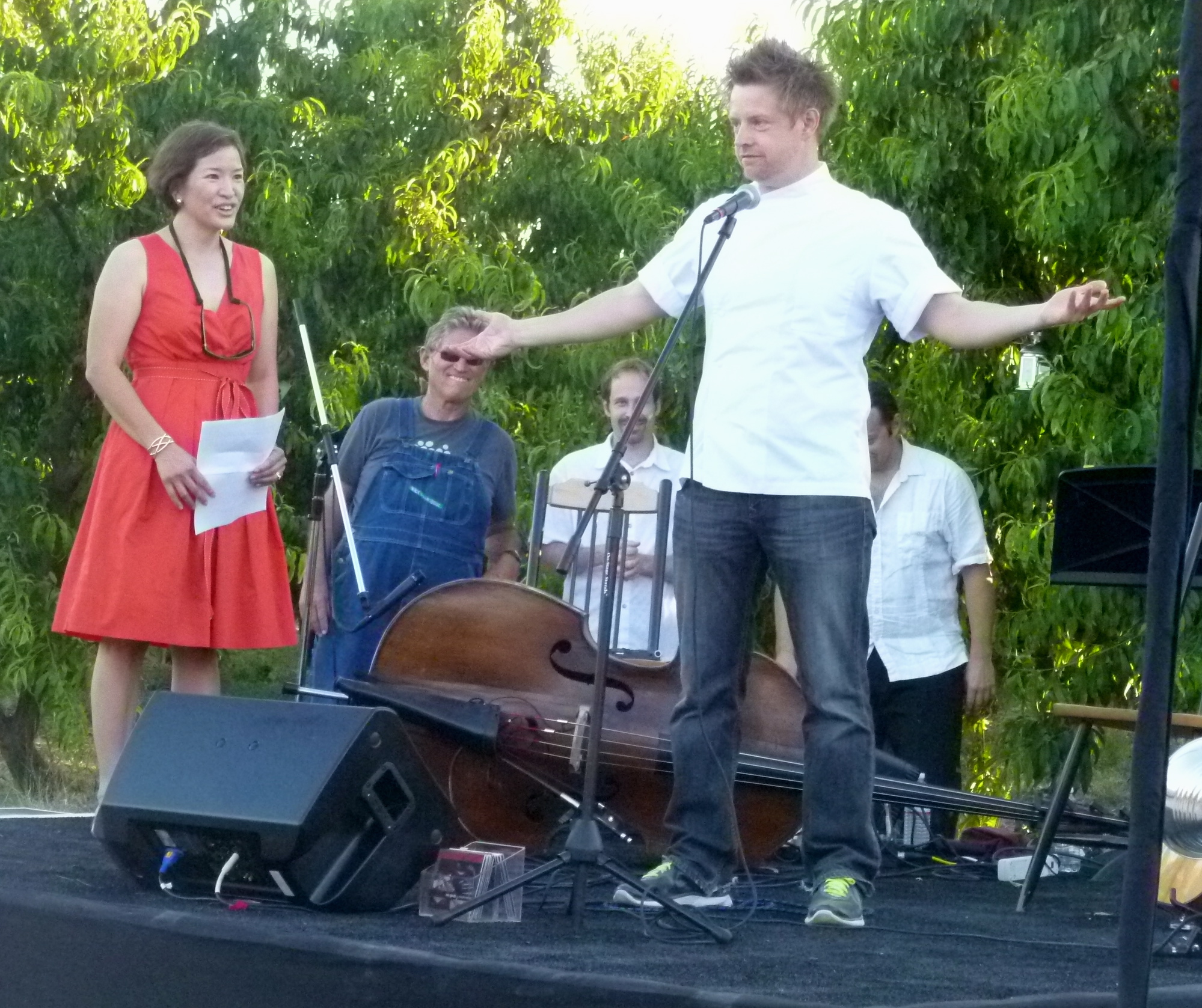 Carolyn introduces Farmer Al to crowd, who thanks everyone for coming to this event and supporting such a great organization as Edible Schoolyard. Then Carolyn introduces Chef Blais, who comes bounding on stage, excited to be here. He even admits that he’s a little nervous cooking for such a discerning group as Bay Area folks passionate about food.