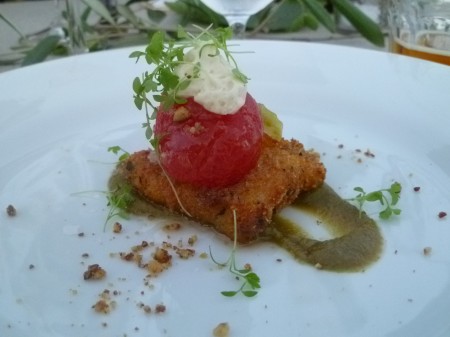I do wonder though, “What happened to the actual chicken?” There was all that humanely raised, organic chicken at some point during the cooking process, but on the plate, al that remains are fried panko crumbs. Weird. Oh well. On to the next course.