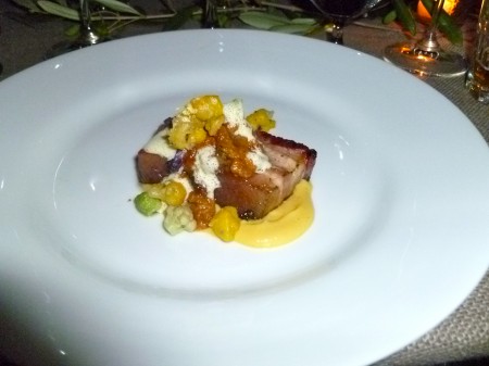 Next comes the Grilled Pork Belly with cauliflower and peaches. It is paired with the Bloomfield Vinyards 2008 Pinot Noir. It is dark outside now and we can’t see our food. My knife has long since been removed by a server, but who needs a knife when the pork belly literally melts in your mouth? It’s delicious, but I still can’t taste the peaches.