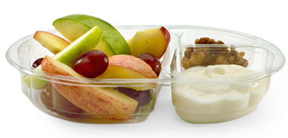 The vanilla yogurt is yummy and low fat and has helped my children get over their fear of plain yogurt. This snack demonstrates to them that fruit, nuts and yogurt are a satisfying snack. It’s easy to handle in the car too.