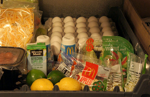 In the walk-in, we saw eggs in cartons by the dozen. A few bags of fresh greens, Maybe 10-15 fresh packs of individual serving blueberries and so on. If I hadn’t seen it for myself, I might not have believed it. We weren’t allowed to photograph it, but a nice kid from Connecticut was allowed to photograph it. His photo looks exactly like what we saw.